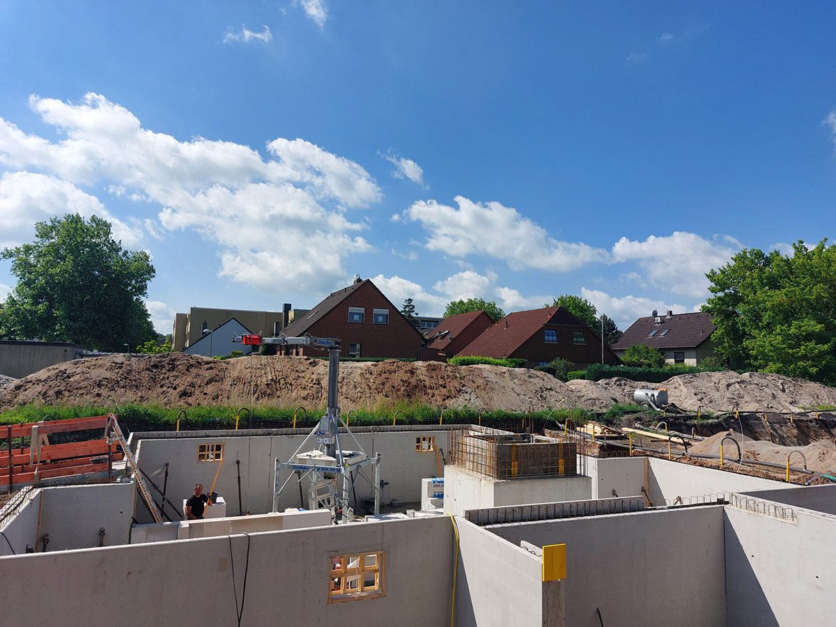 Für das erste Haus ist das Kellergeschoss erstellt: zunächst wurde der Baugrund vorbereitet, Fundamente gesetzt, Bewehrung eingebaut und der Beton für die Bodenplatte gegossen.